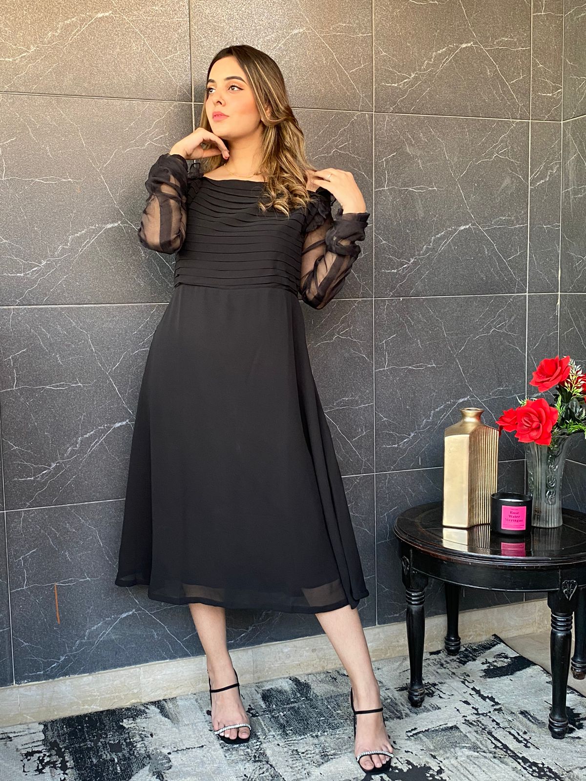 Our best seller exquisite dress with horizontal pleated bodice, broad square neckline and organza sleeves. Perfect to wear on Birthdays or any formal events!