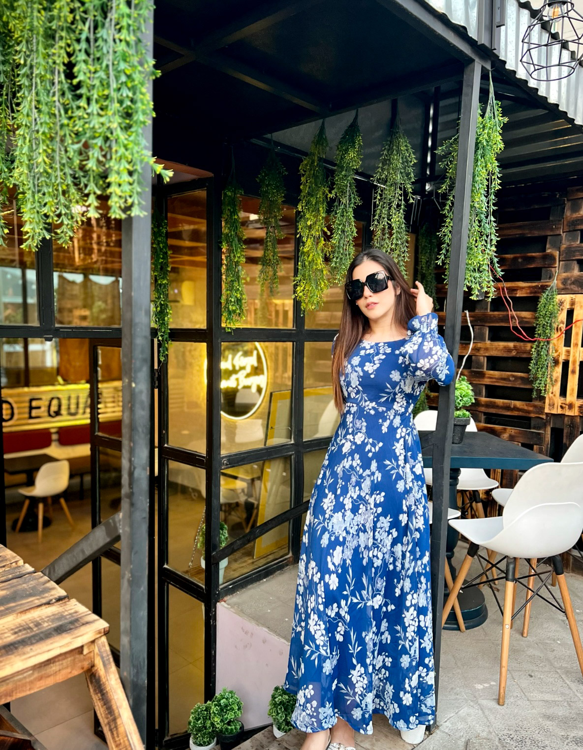 Royal Blue Chiffon Maxi with a cottage-core vibe, with cute long ruffled sleeves and a broad neckline with huge flair!