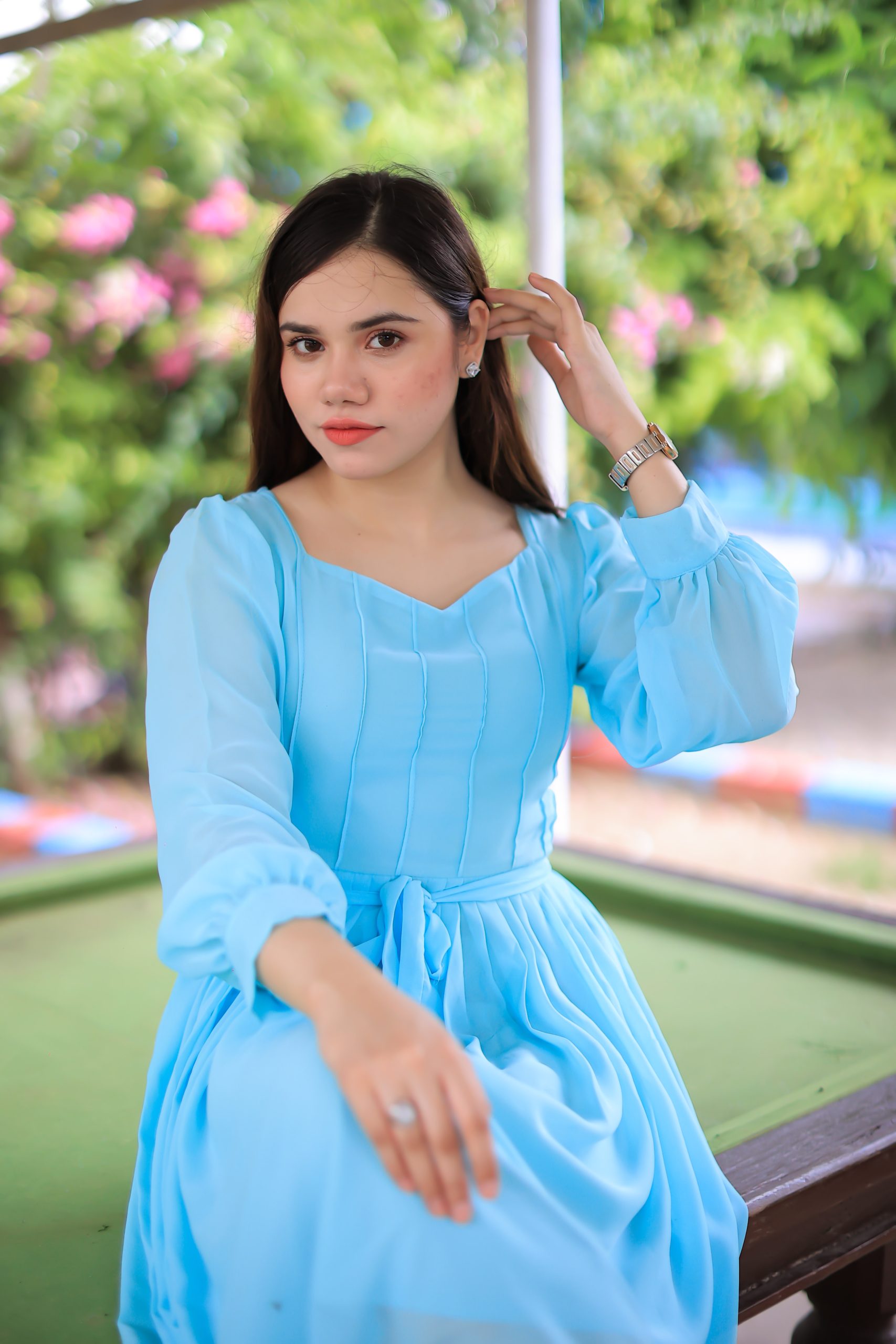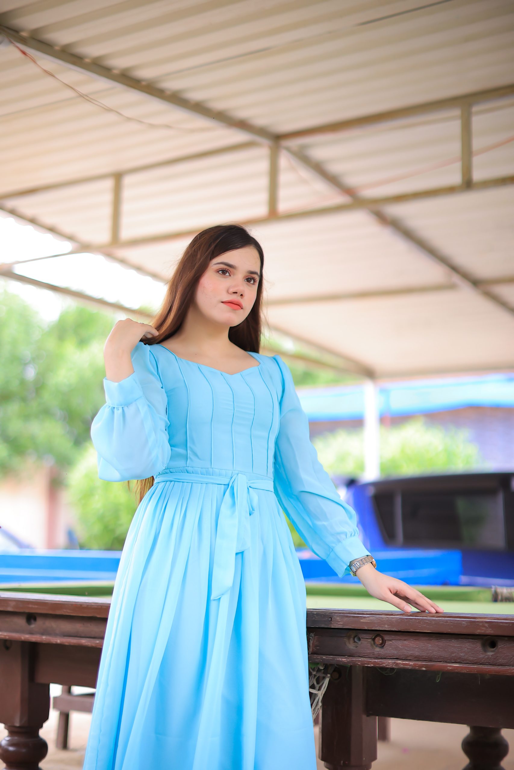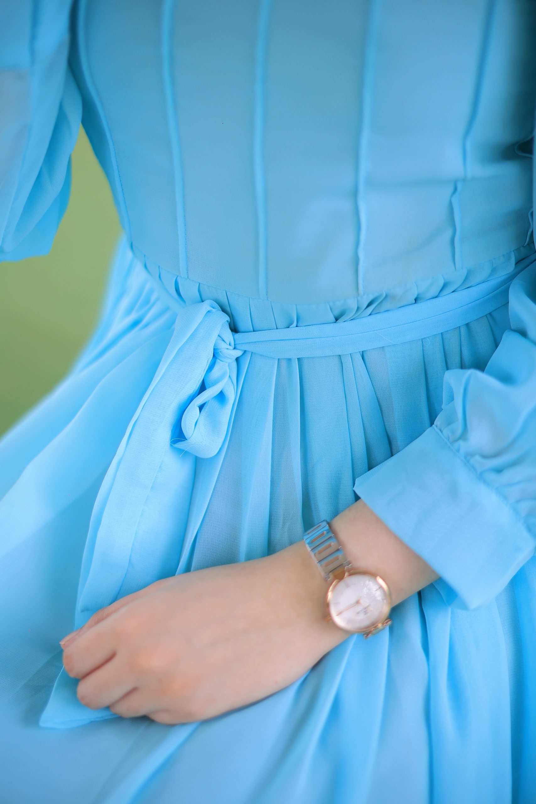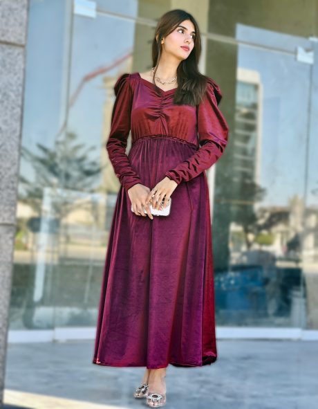 A classic dress with intricate pleats and a modish belt, trendy neckline and sleeves. A perfect fit for your wardrobe!