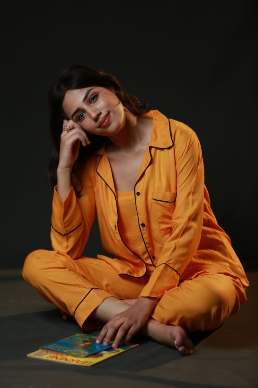Embrace the comfort of this Three-Piece PJs, with camisole along with upper and loose trousers.