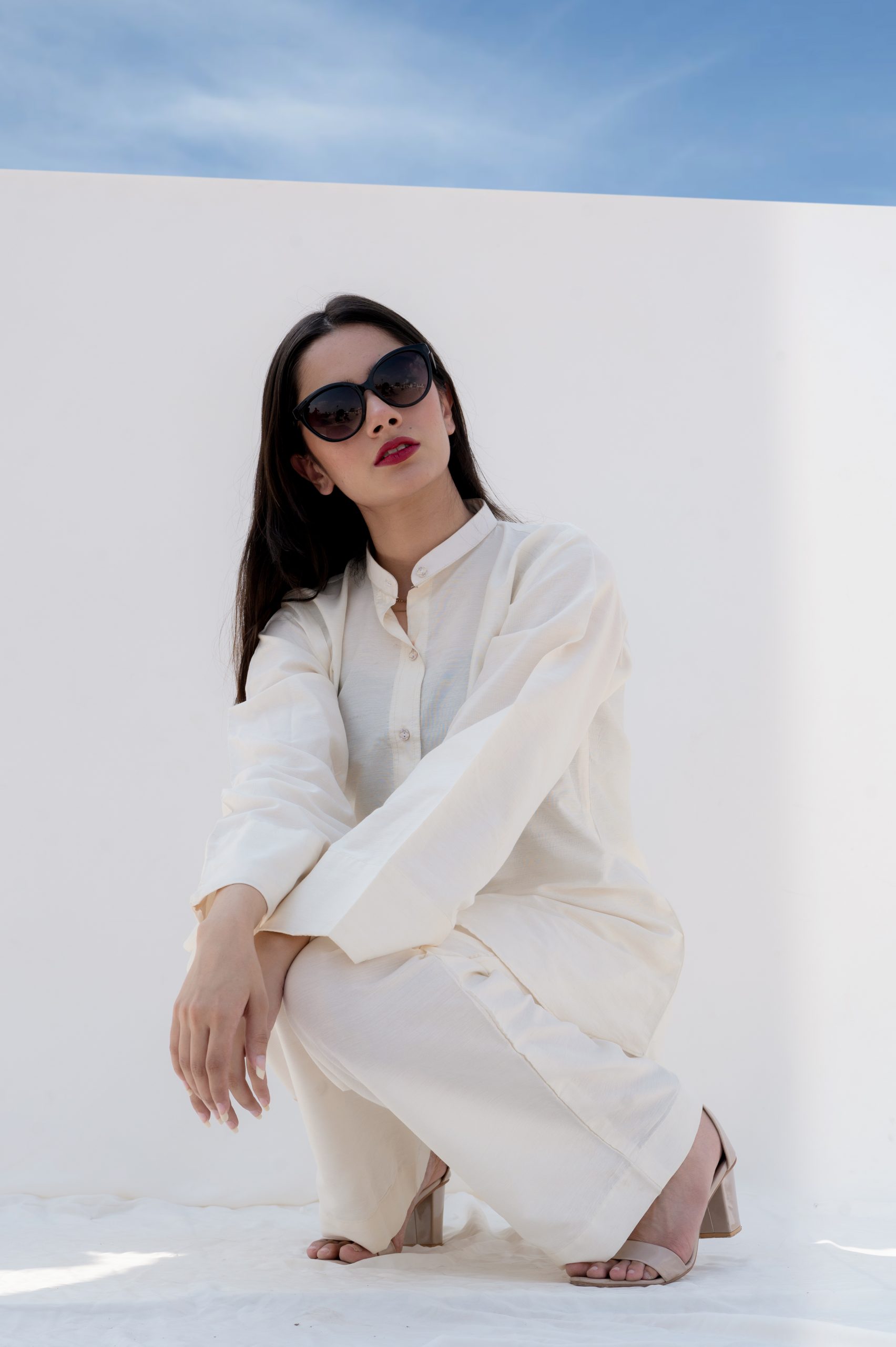 A chic white co- ord set is all we need in life to feel clear-headed and calm. Chic yet tendy composition is layered over this elegant viscose. Add this outfit in your wardrobe like a soothing rhythm to a colorless day.