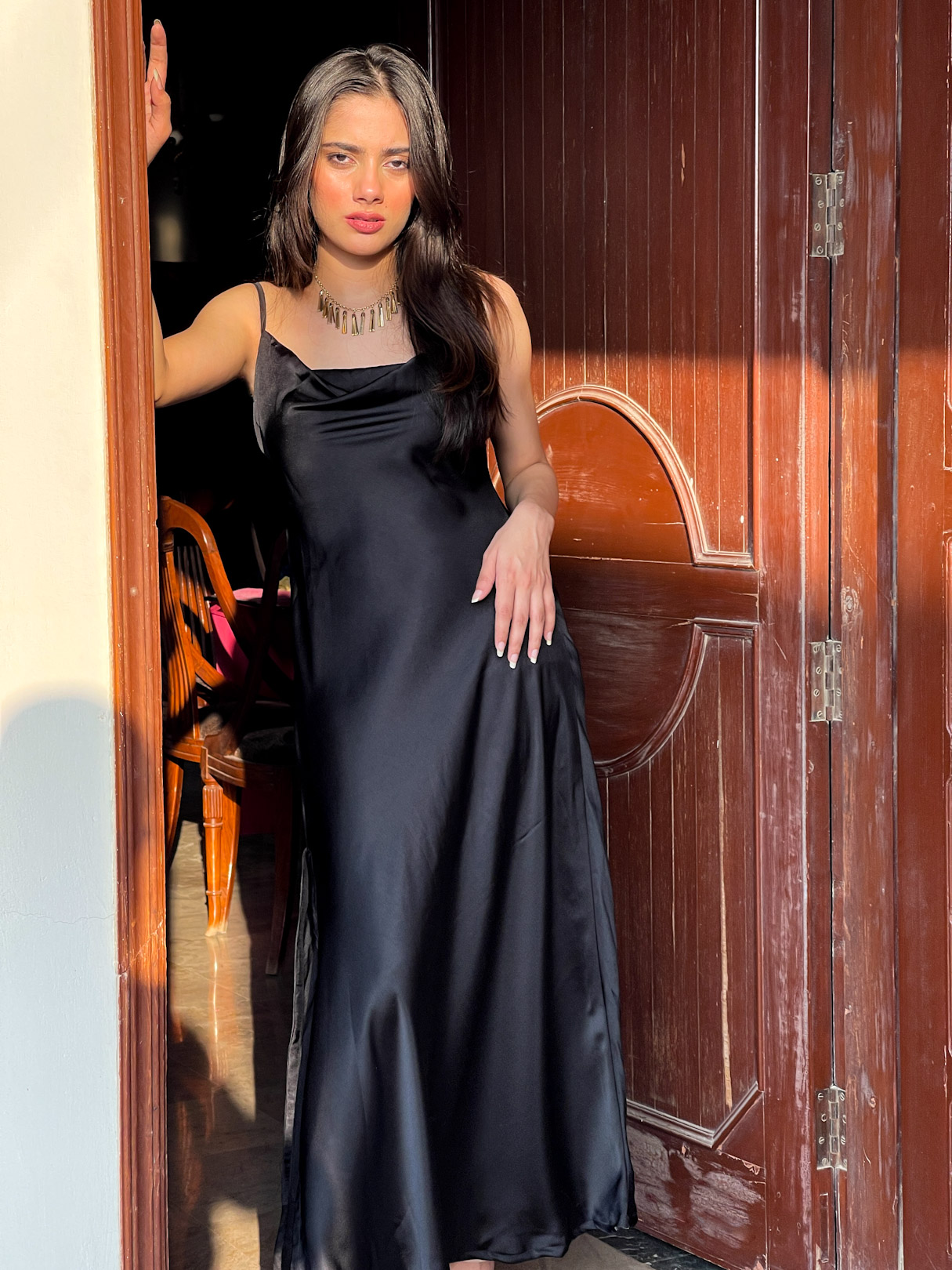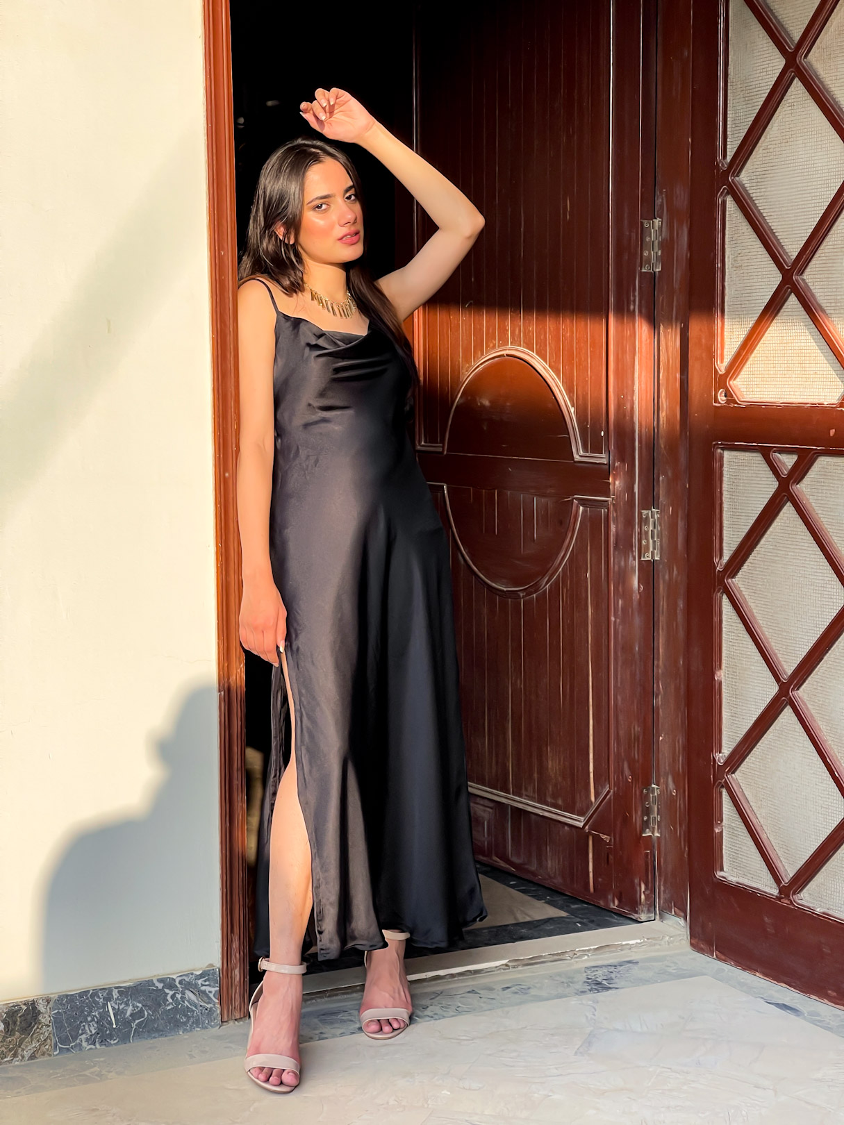 This beautiful Black color offers a simple chic silhouette to give this silk dress room to shine. Along with a cowl neckline and side slit for a luxurious look for a beautiful, figure-skimming drape.