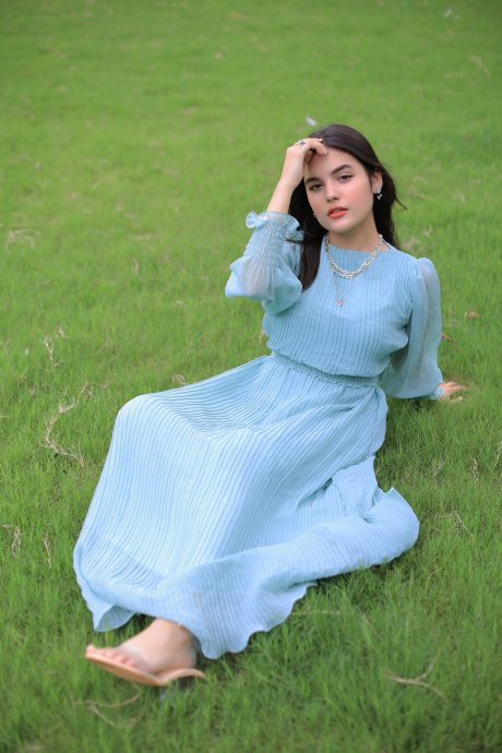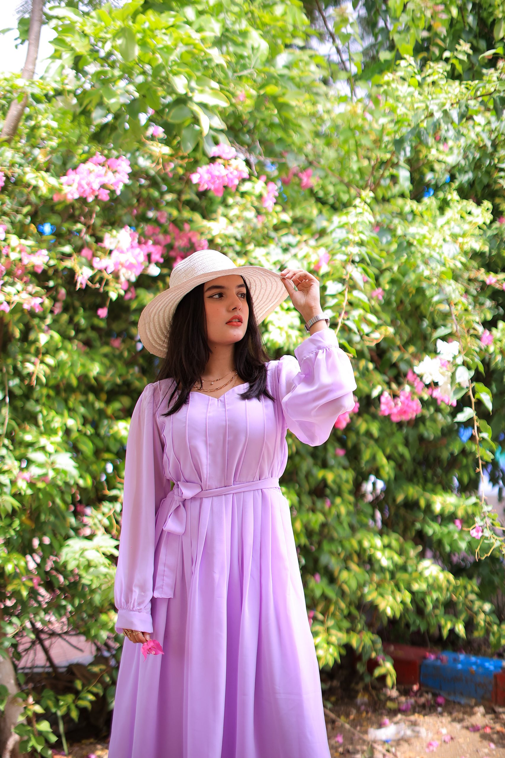 A classic dress with intricate pleats and a modish belt, trendy neckline and sleeves. A perfect fit for your wardrobe!