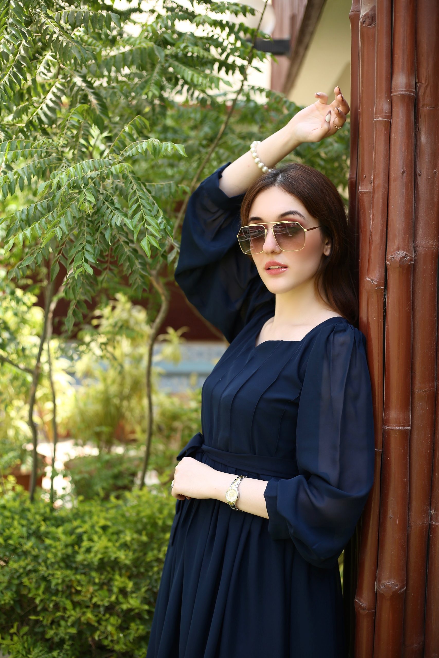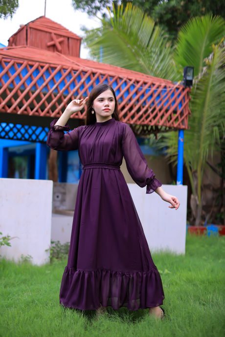 A classic dress with intricate pleats and a modish belt, trendy neckline and sleeves. A perfect fit for your wardrobe!