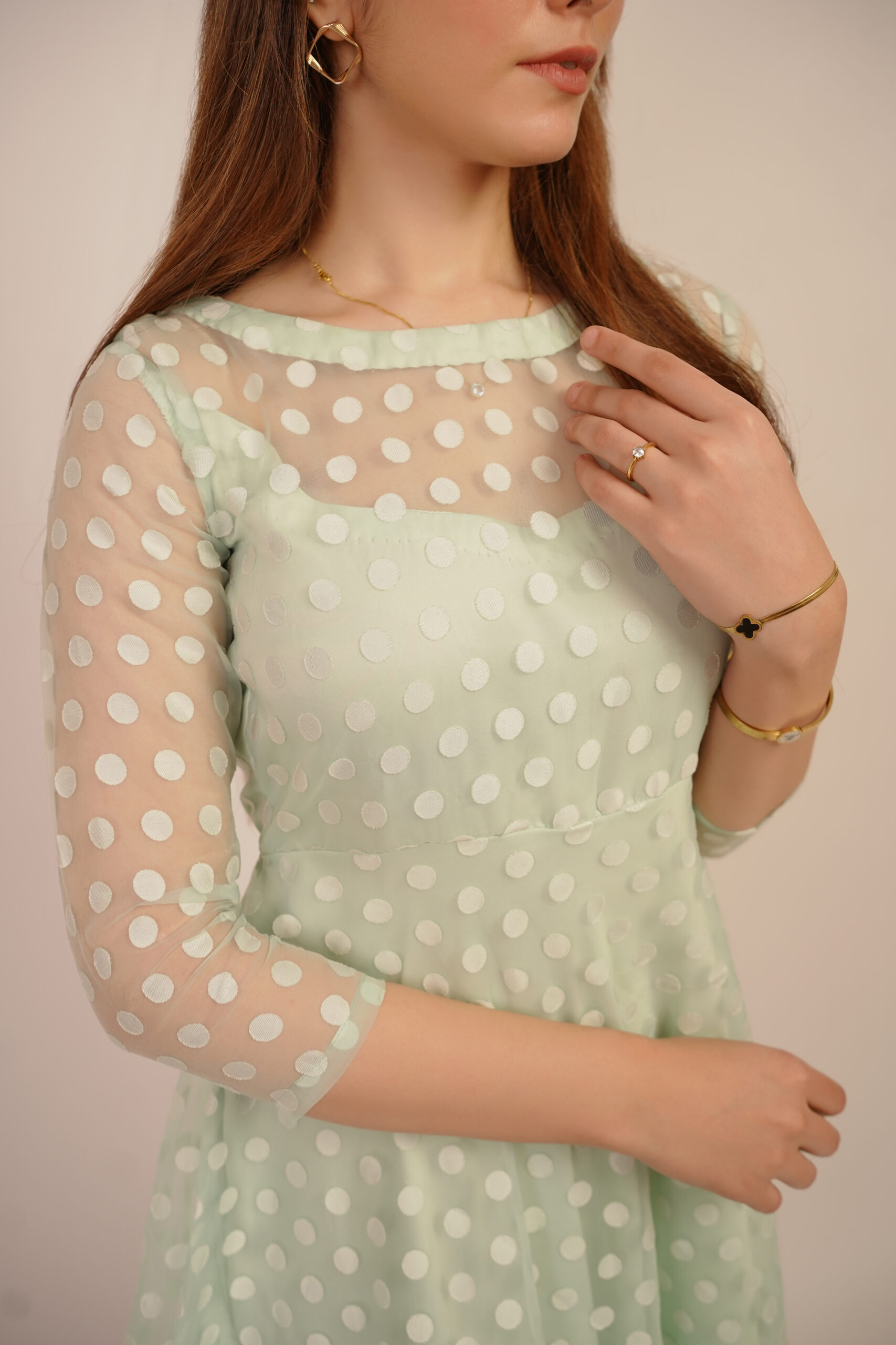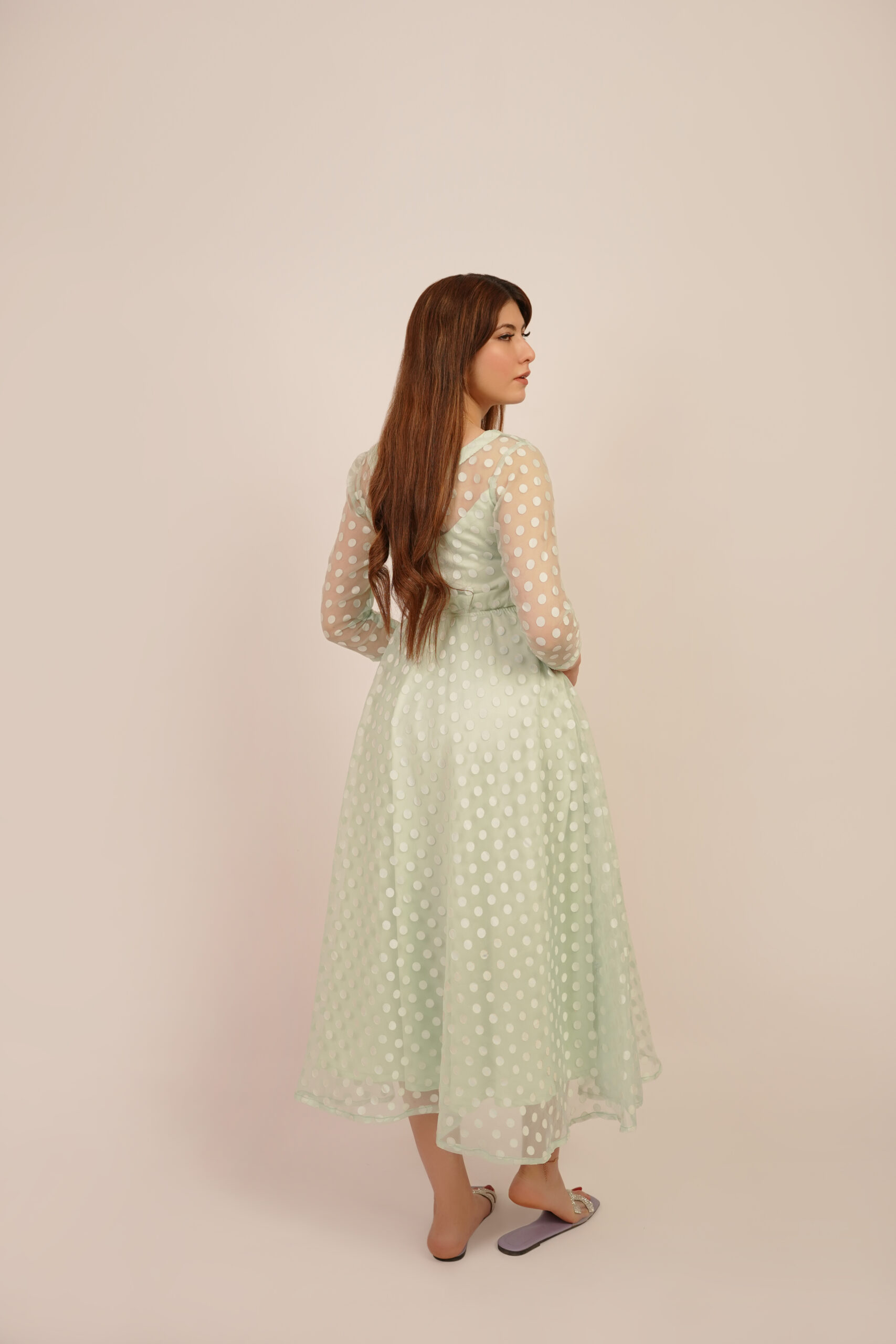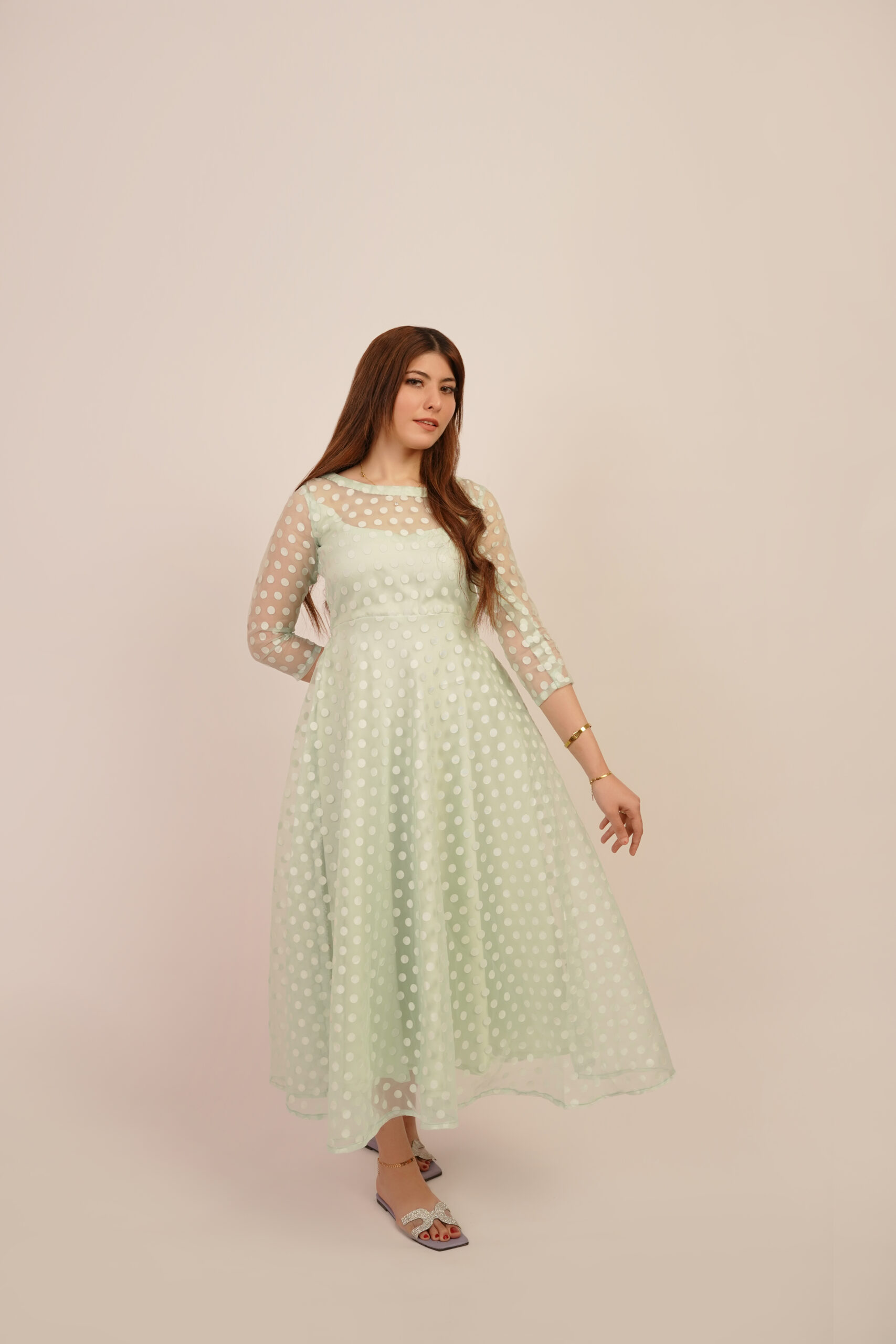 Introducing the ‘Minty Polka’ dress, a captivating fusion of modern style and classic charm. Crafted from luxurious net organza fabric, this dress boasts a whimsical allure with its playful polka dot pattern and refreshing mint hue. Elevate your wardrobe with this graceful masterpiece that captures the essence of femininity and grace.