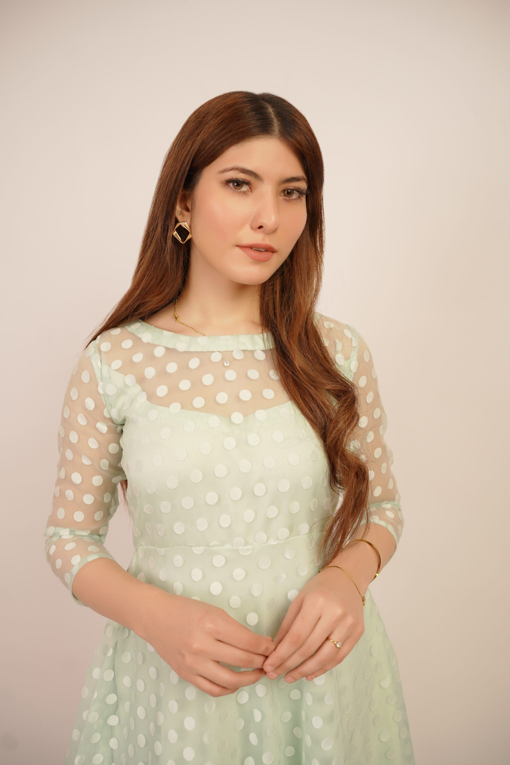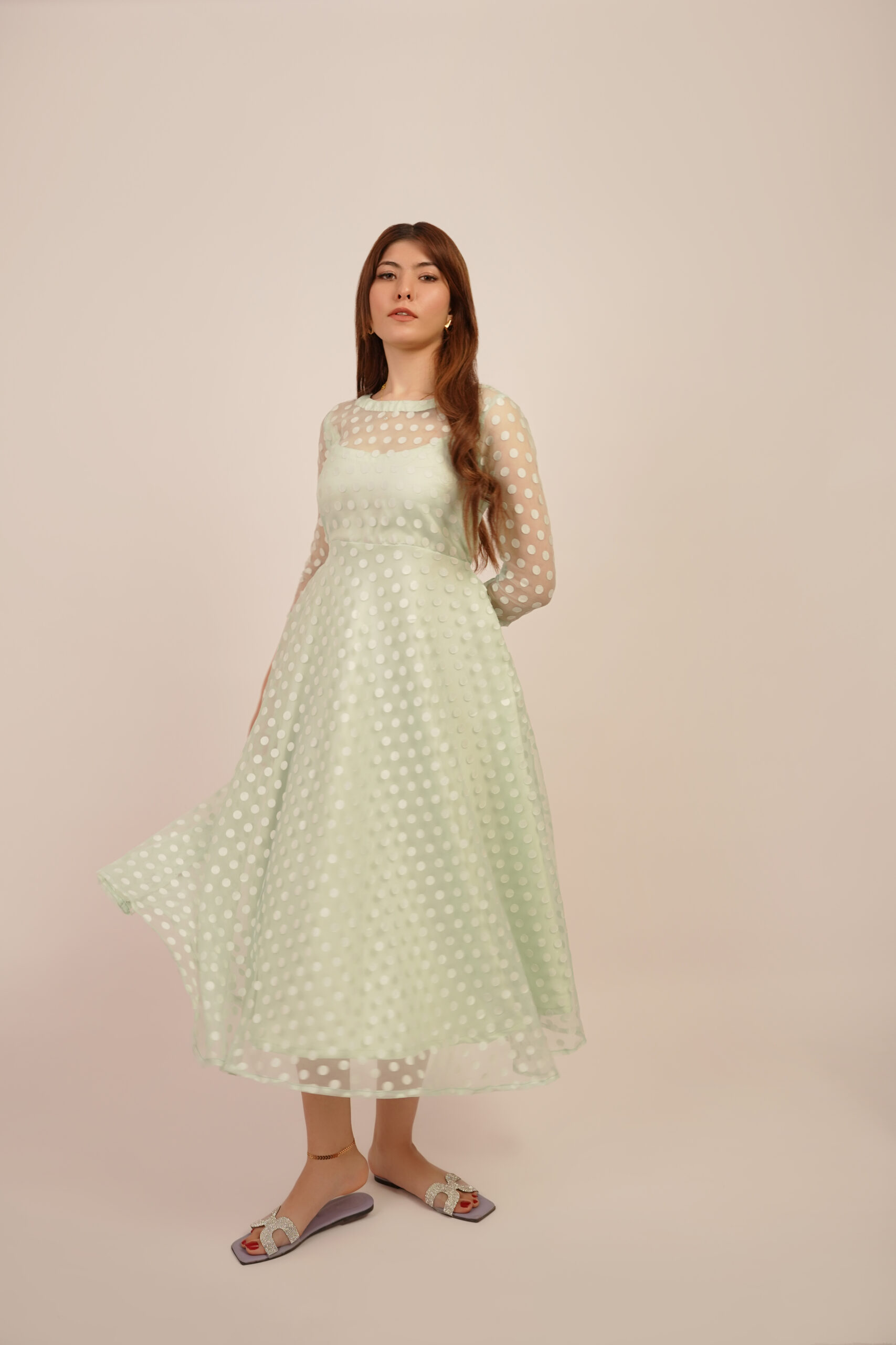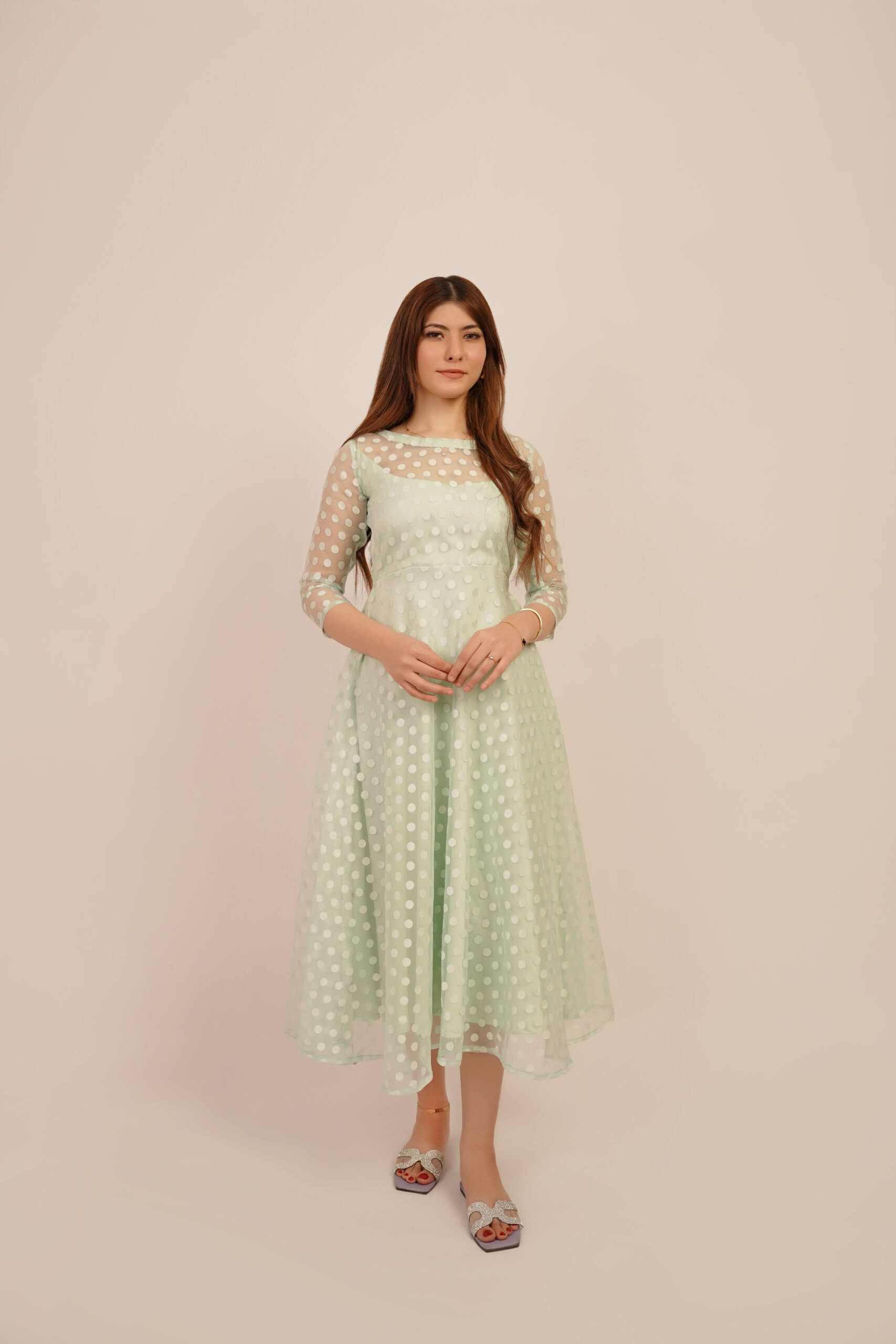 Introducing the ‘Minty Polka’ dress, a captivating fusion of modern style and classic charm. Crafted from luxurious net organza fabric, this dress boasts a whimsical allure with its playful polka dot pattern and refreshing mint hue. Elevate your wardrobe with this graceful masterpiece that captures the essence of femininity and grace.