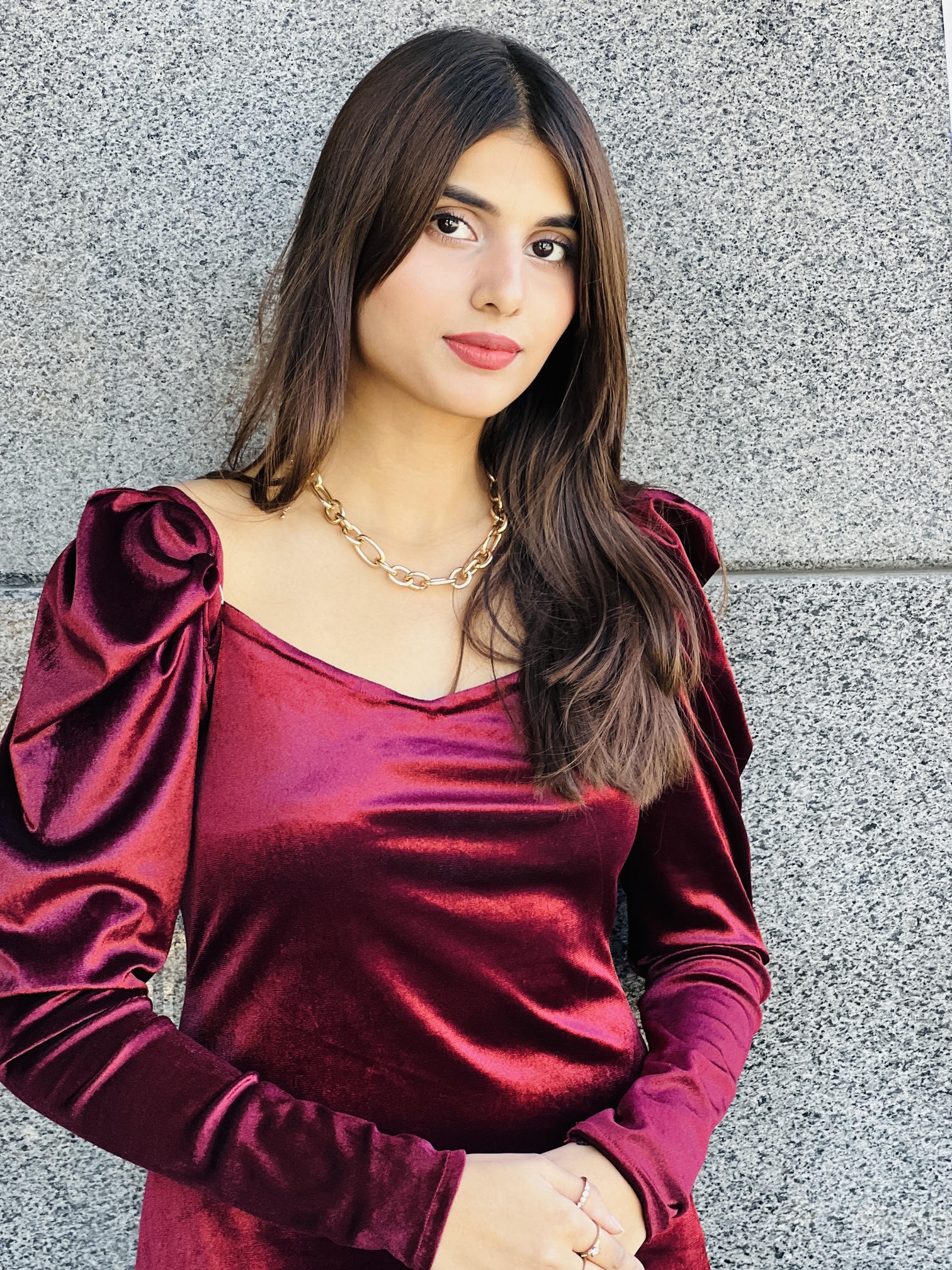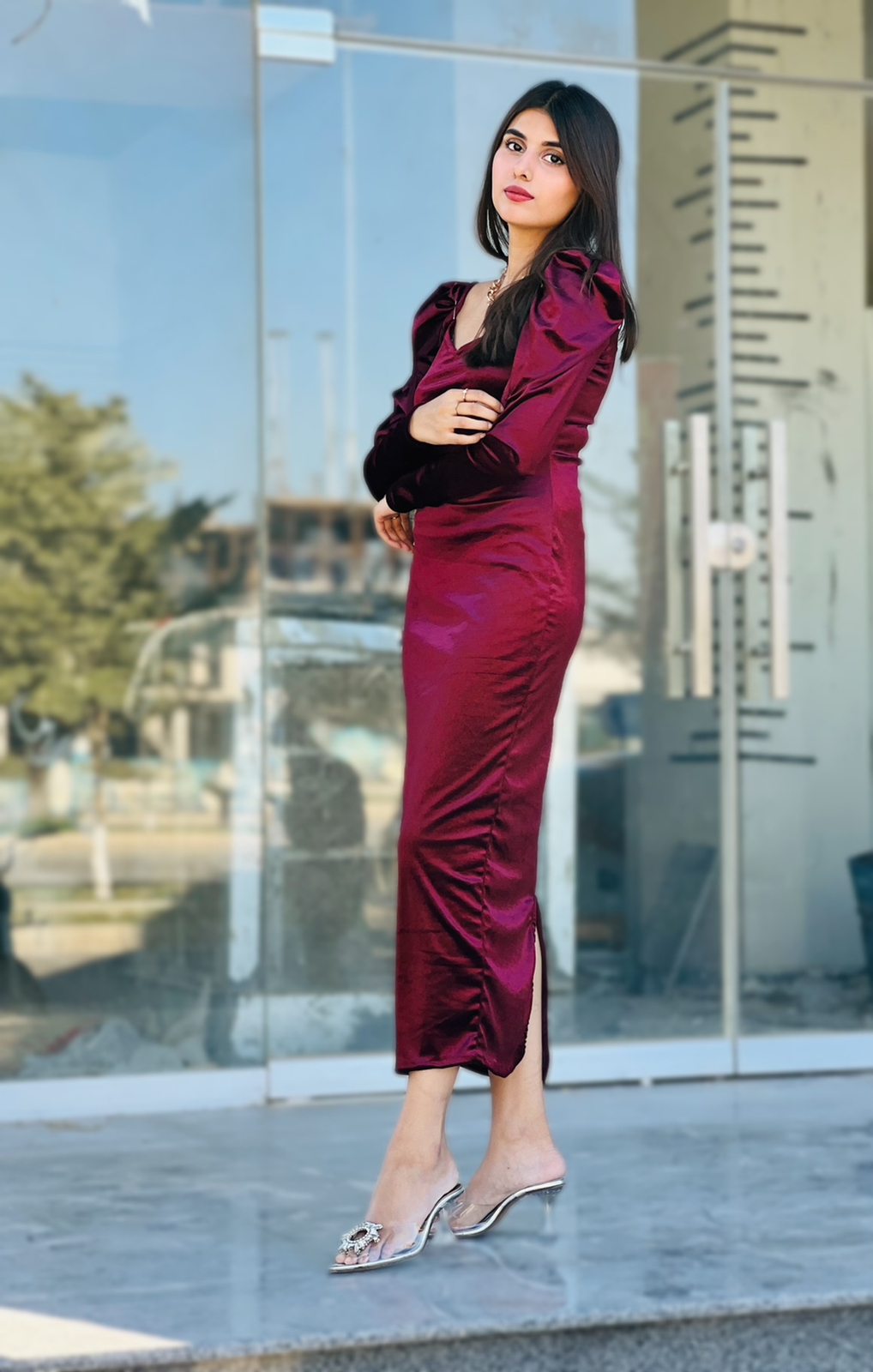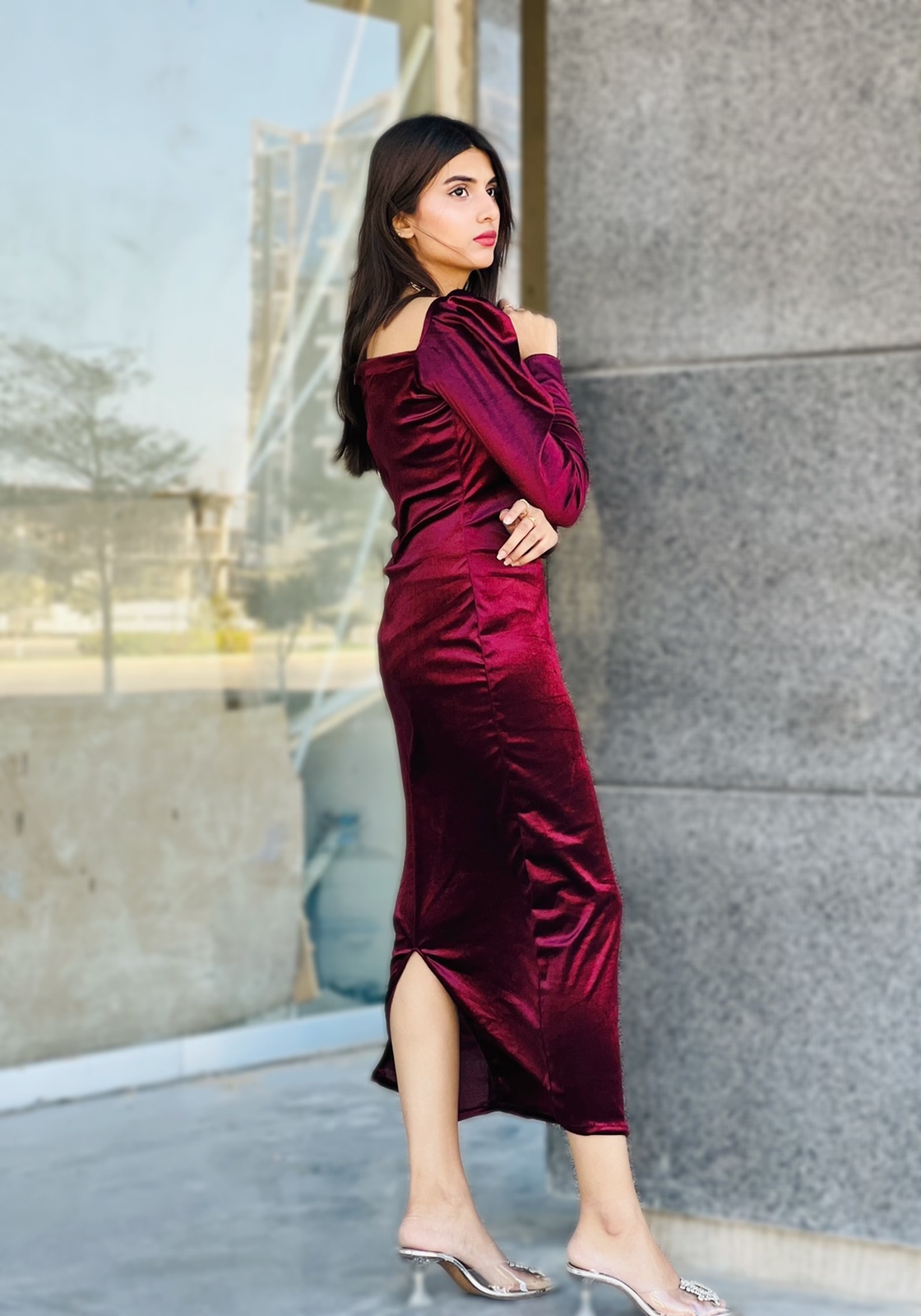 Emanate power and modesty while wearing this edgy yet refined tailor-made Ruby velvet dress. Featuring a sweetheart neckline along with puffed sleeves and a sassy slit at the back.