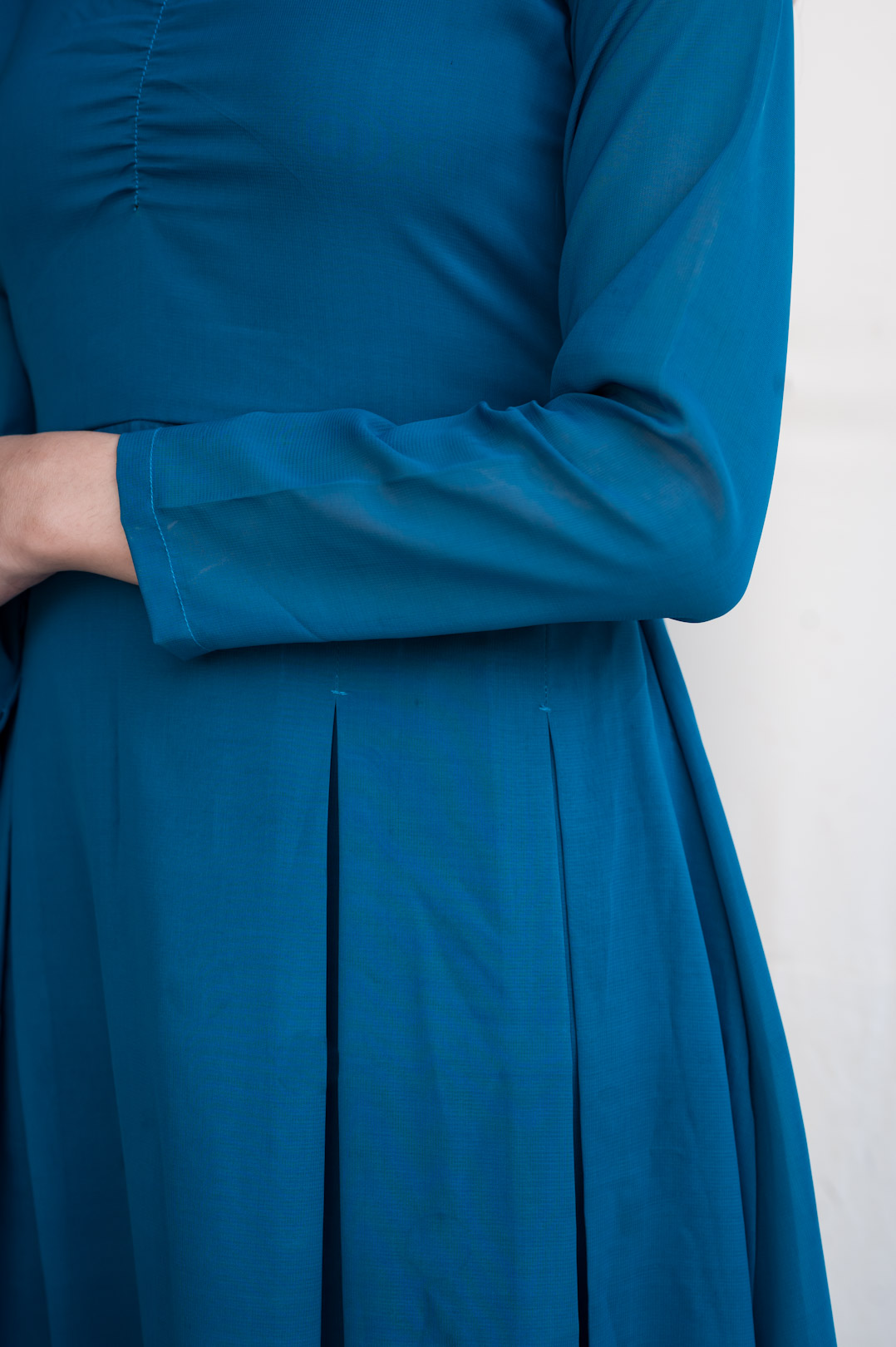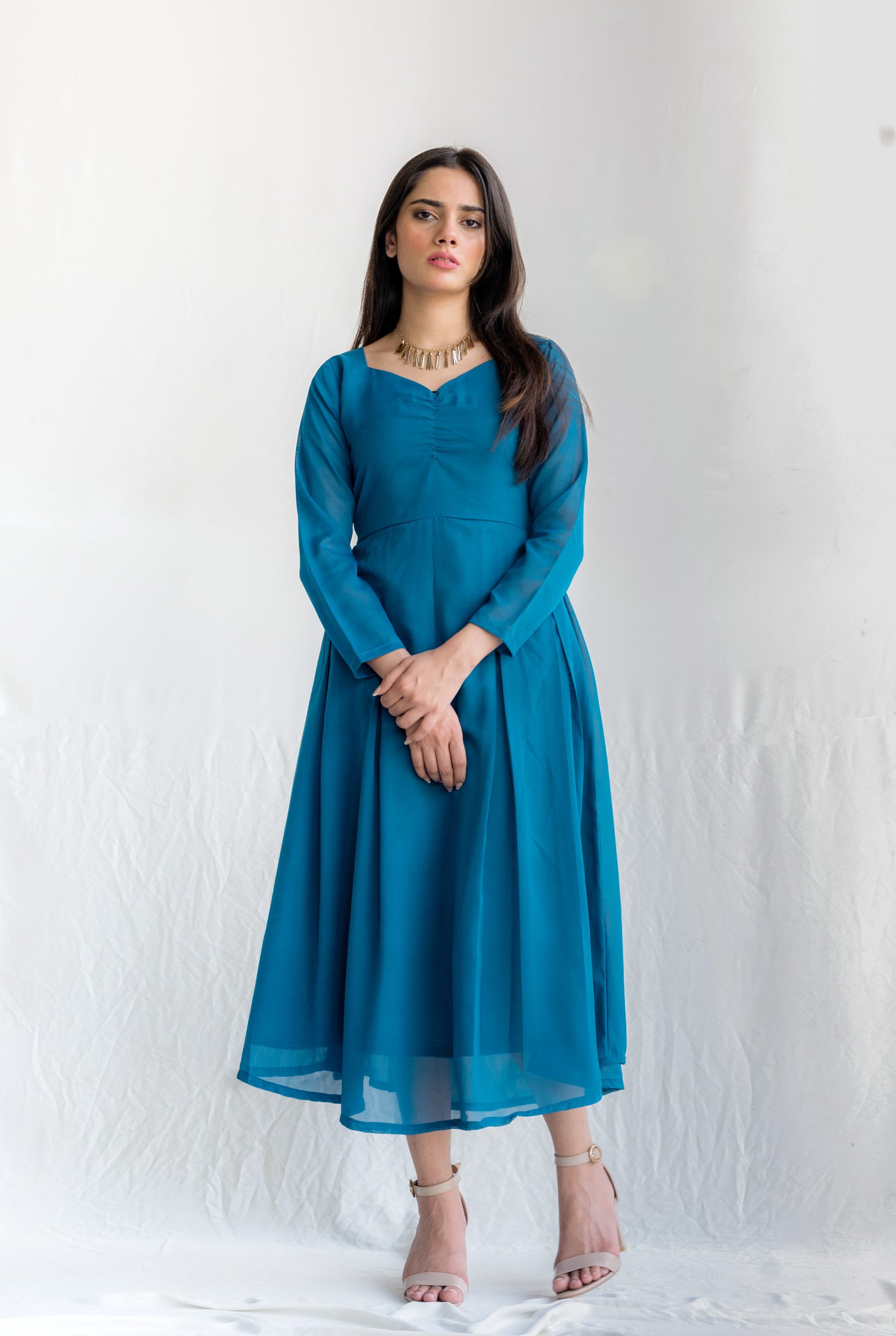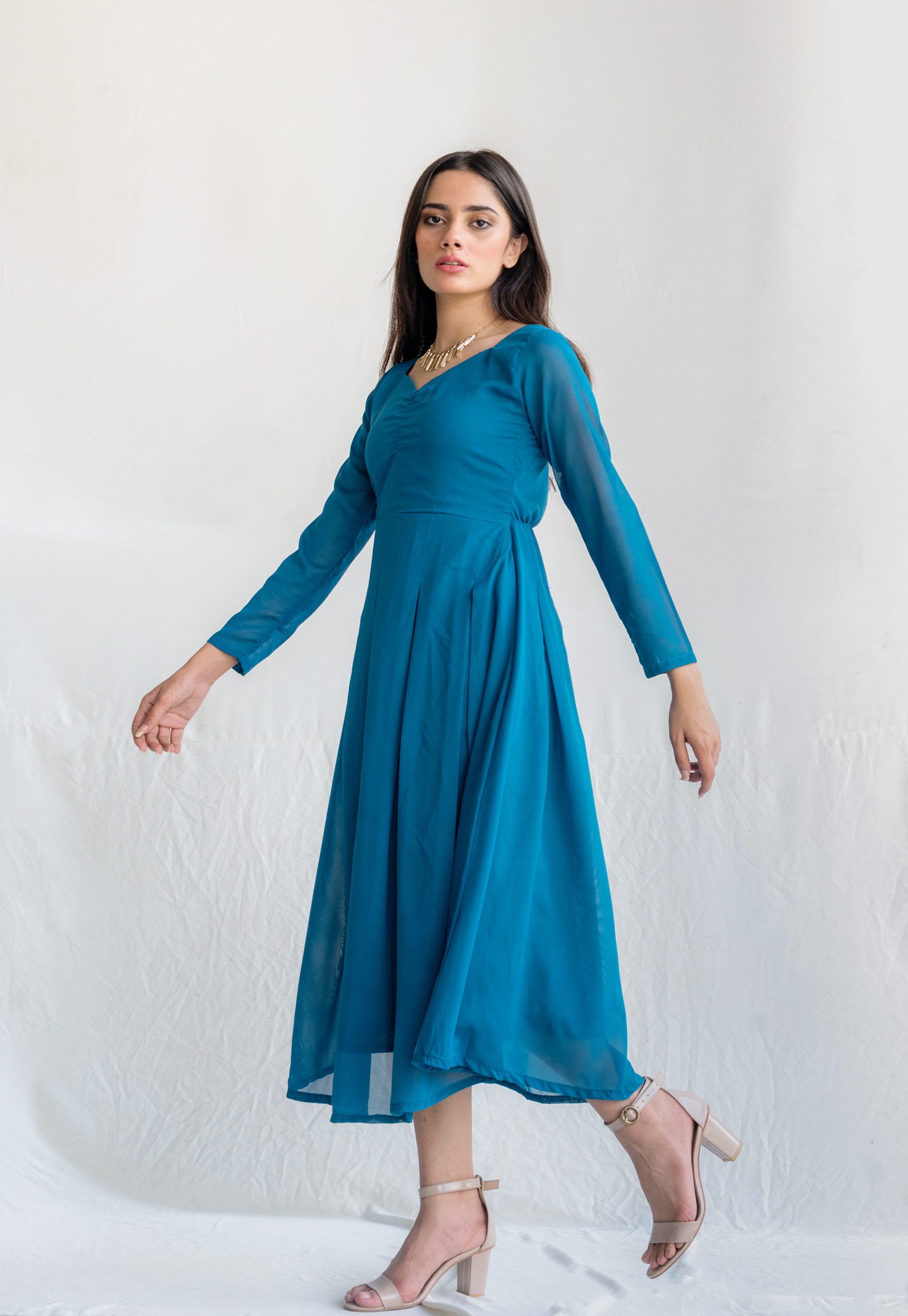 Our stunning Teal Blue Maxi dress! Crafted from a lightweight, flowy fabric in a mesmerizing shade of blue featuring a classic V neckline and straight-fit sleeves that ensure a perfect fit. The waistline is cinched with a subtle elastic band, creating a beautiful silhouette that complements any body type.