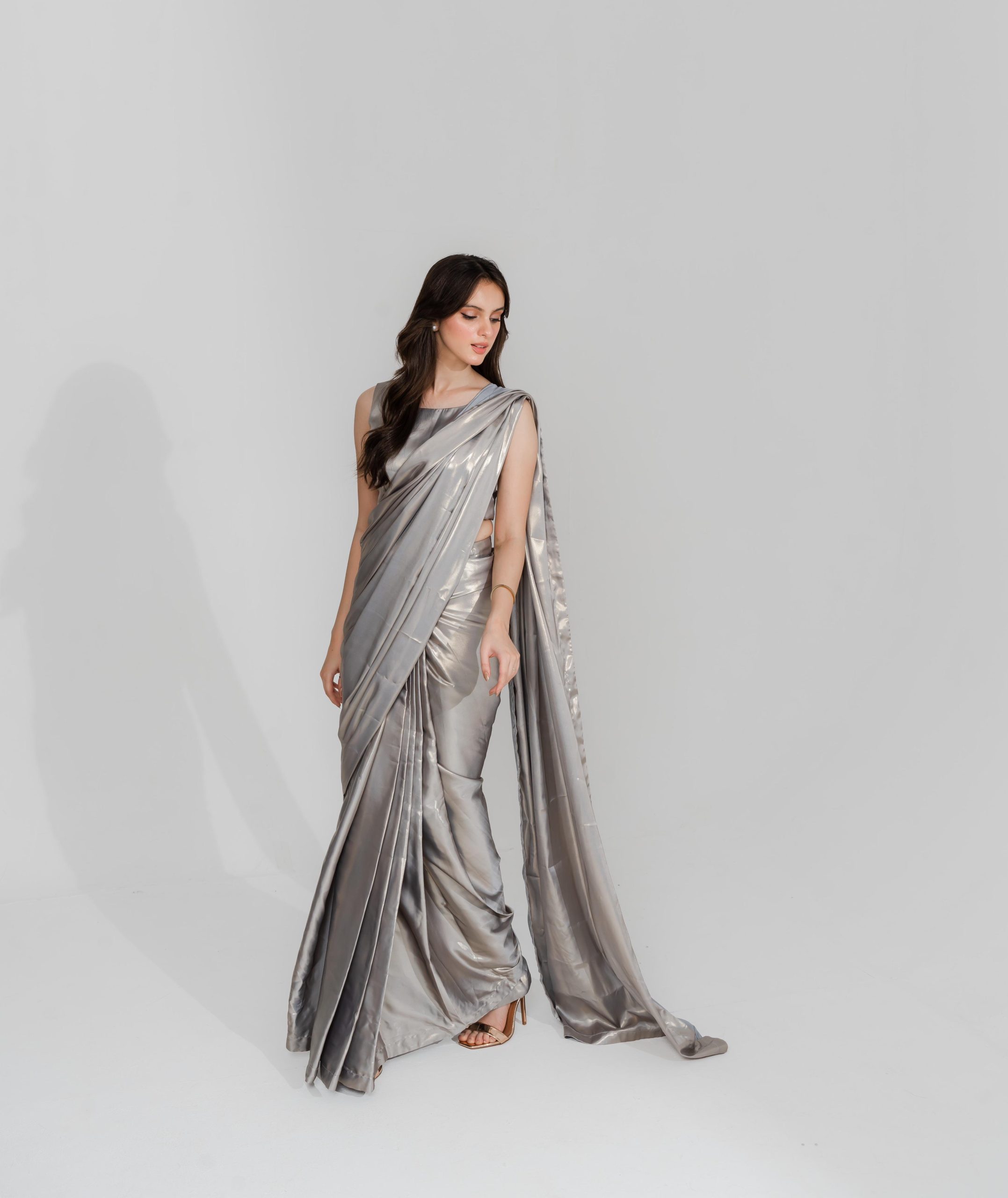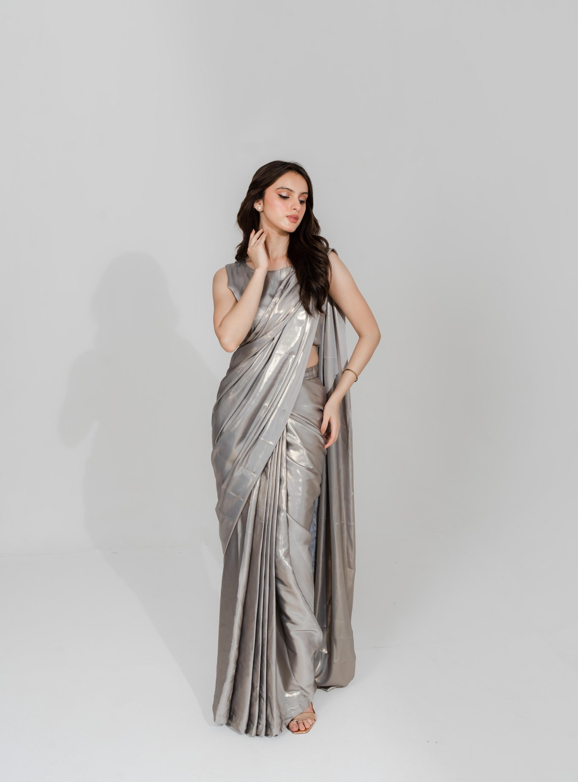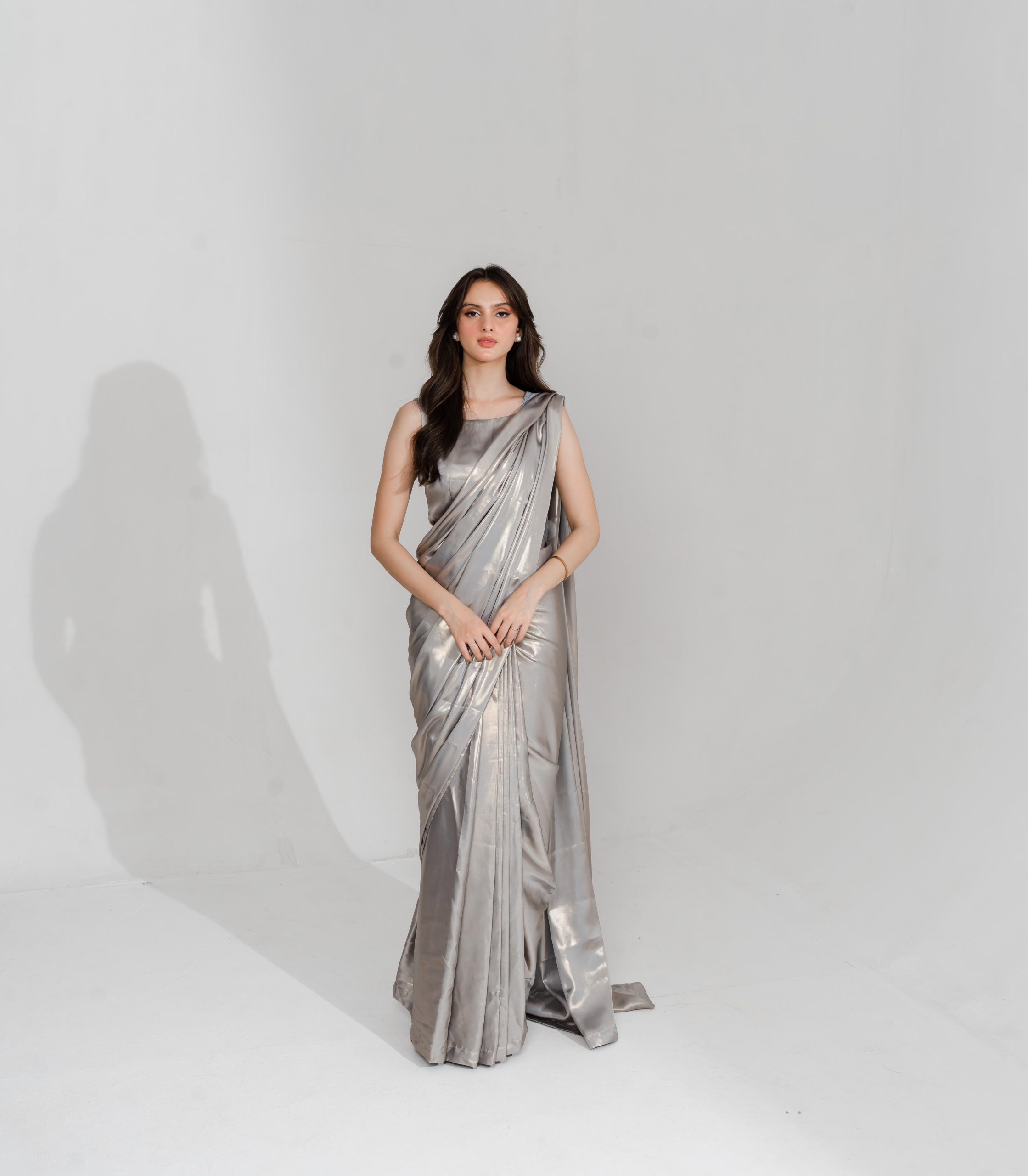 Exude Radiance and Elegance with this Mesmerizing Shimmer Saree, Showcasing an Alluring design along with its sleeveless blouse combining modern fashion with timeless grace