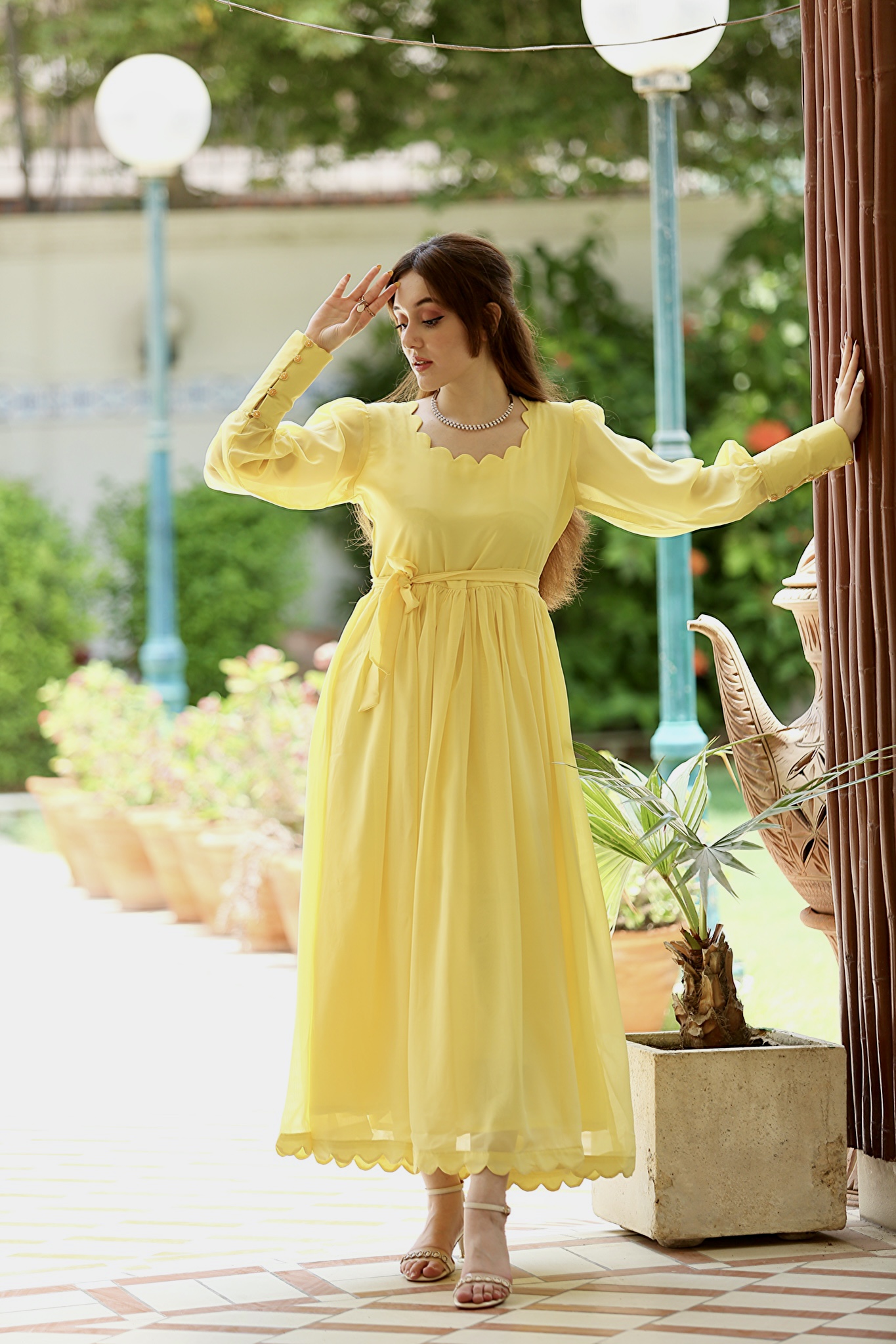 Be the belle with our Yellow long flaired maxi with a pretty patterned neckline, buttoned up cuff sleeves and a vintage style.
