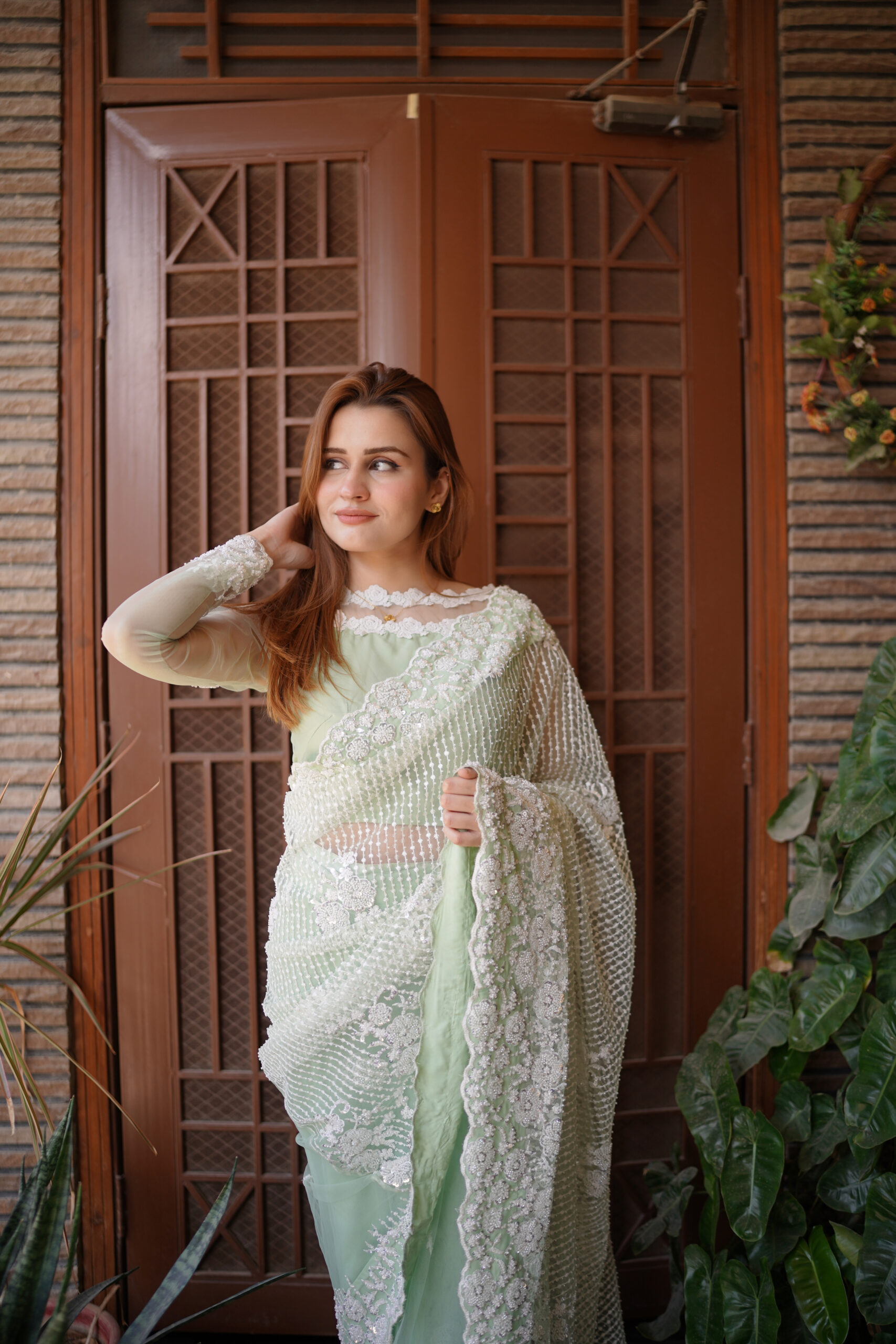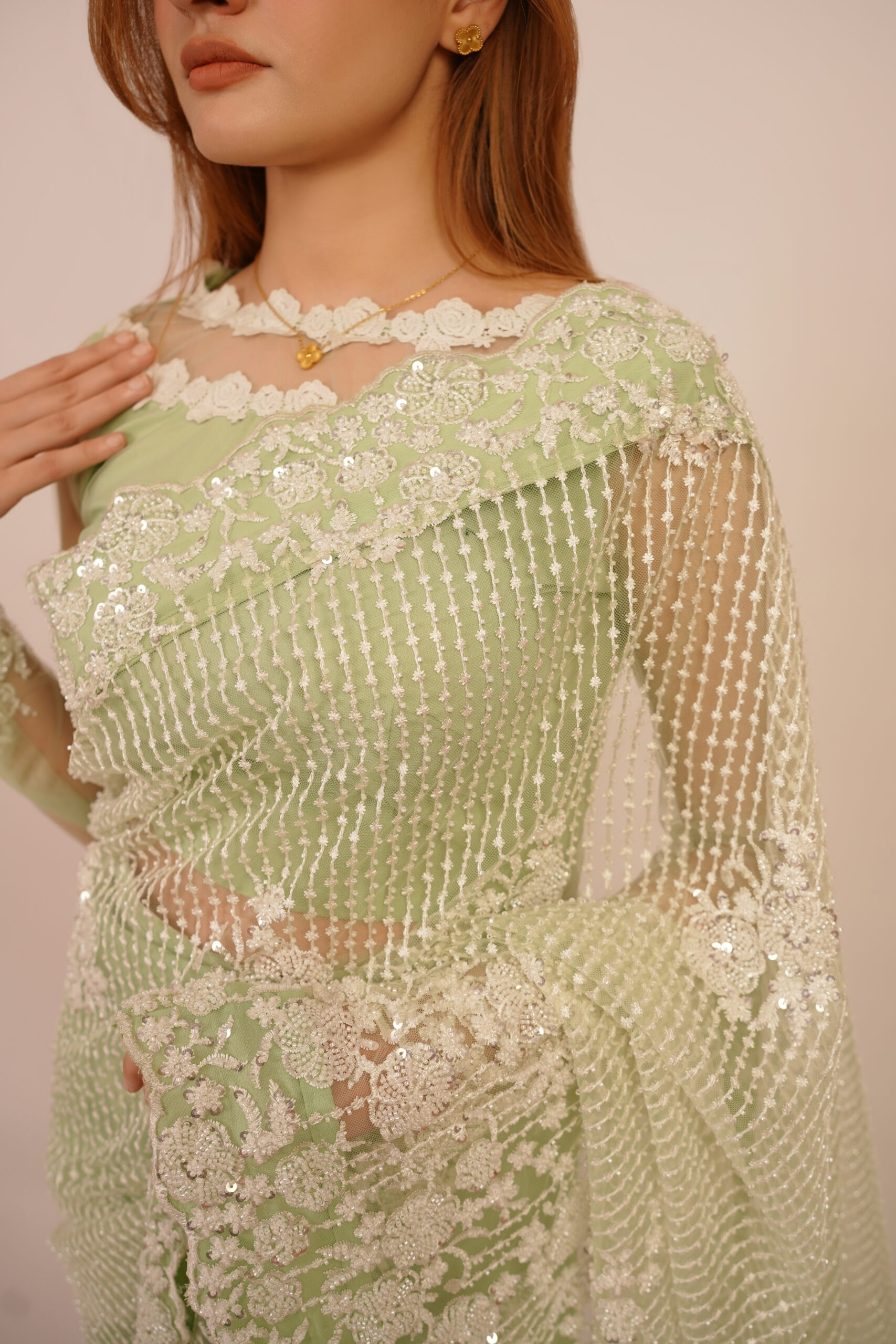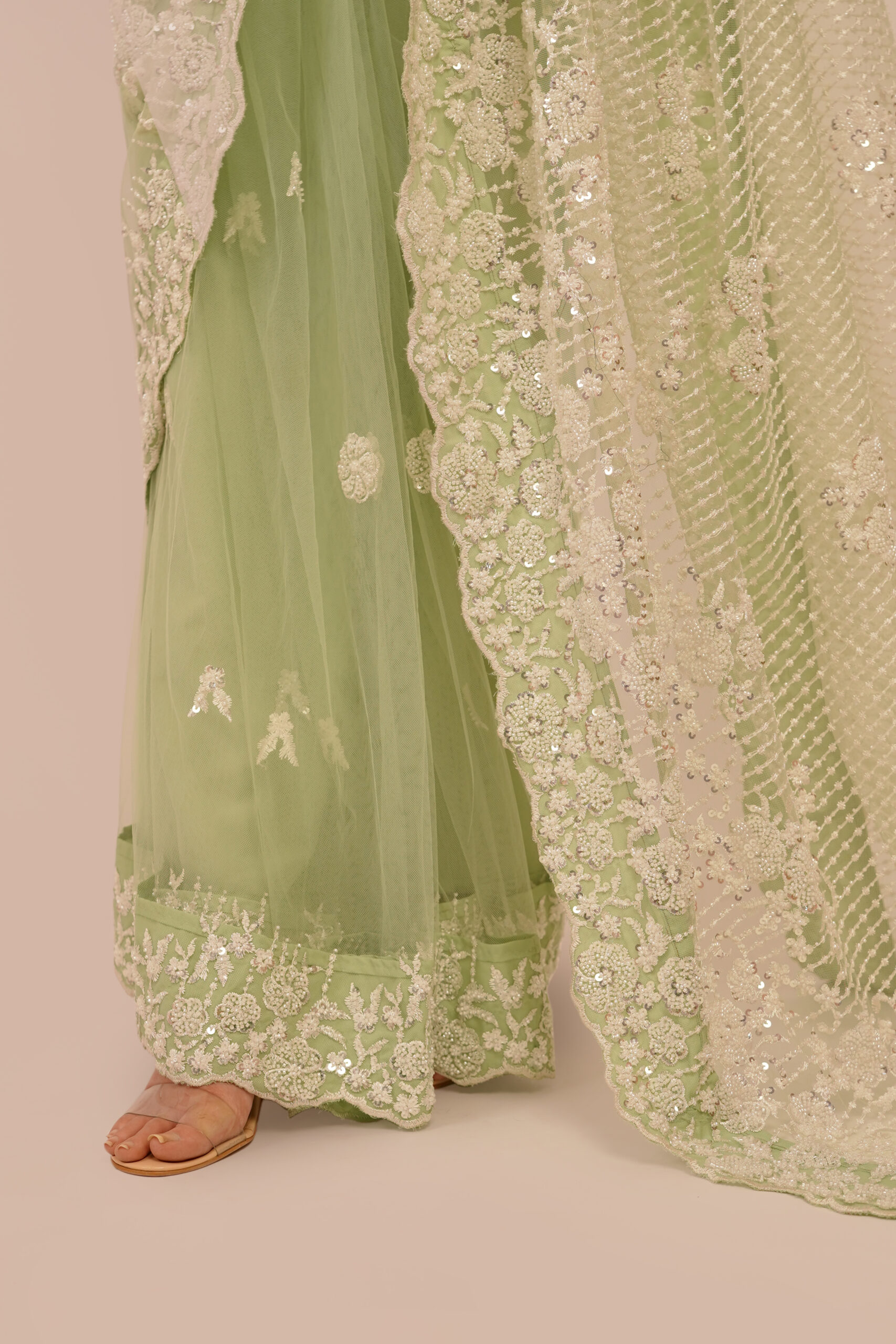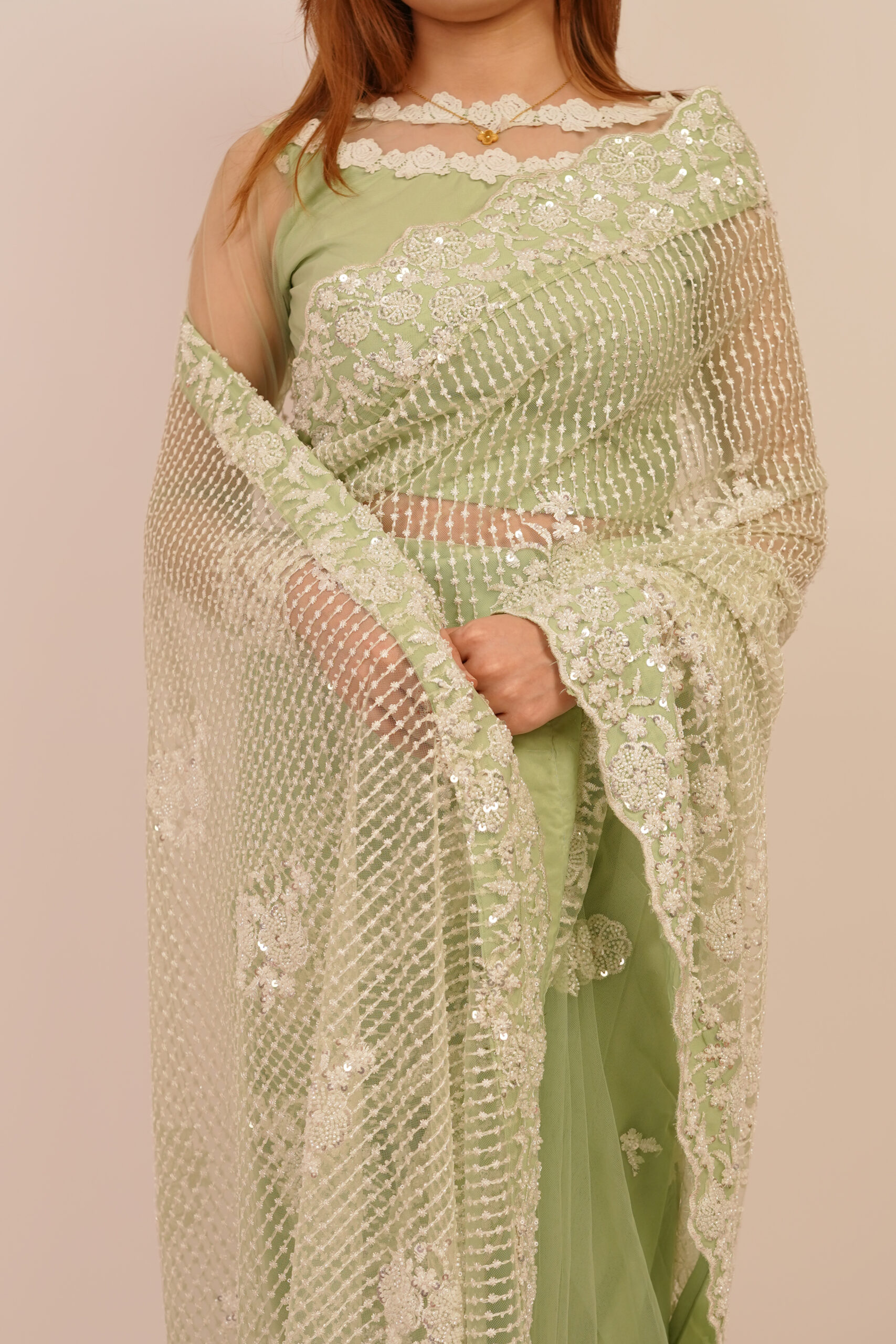 Verdant Veil is crafted with delicate net fabric and adorned with intricate light green embroidery, this saree embodies the freshness of a verdant meadow, offering an enchanting and serene allure to its wearer.