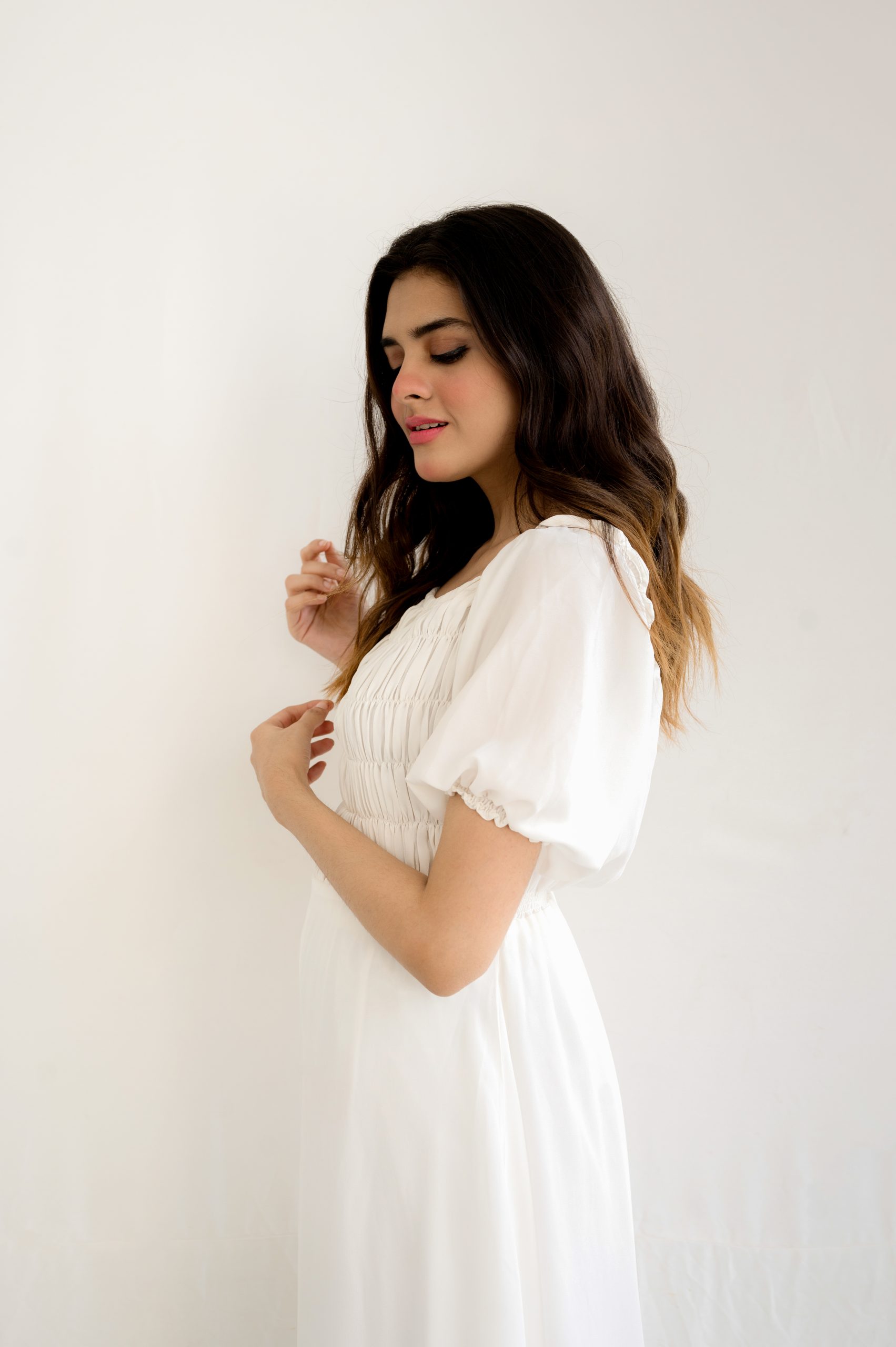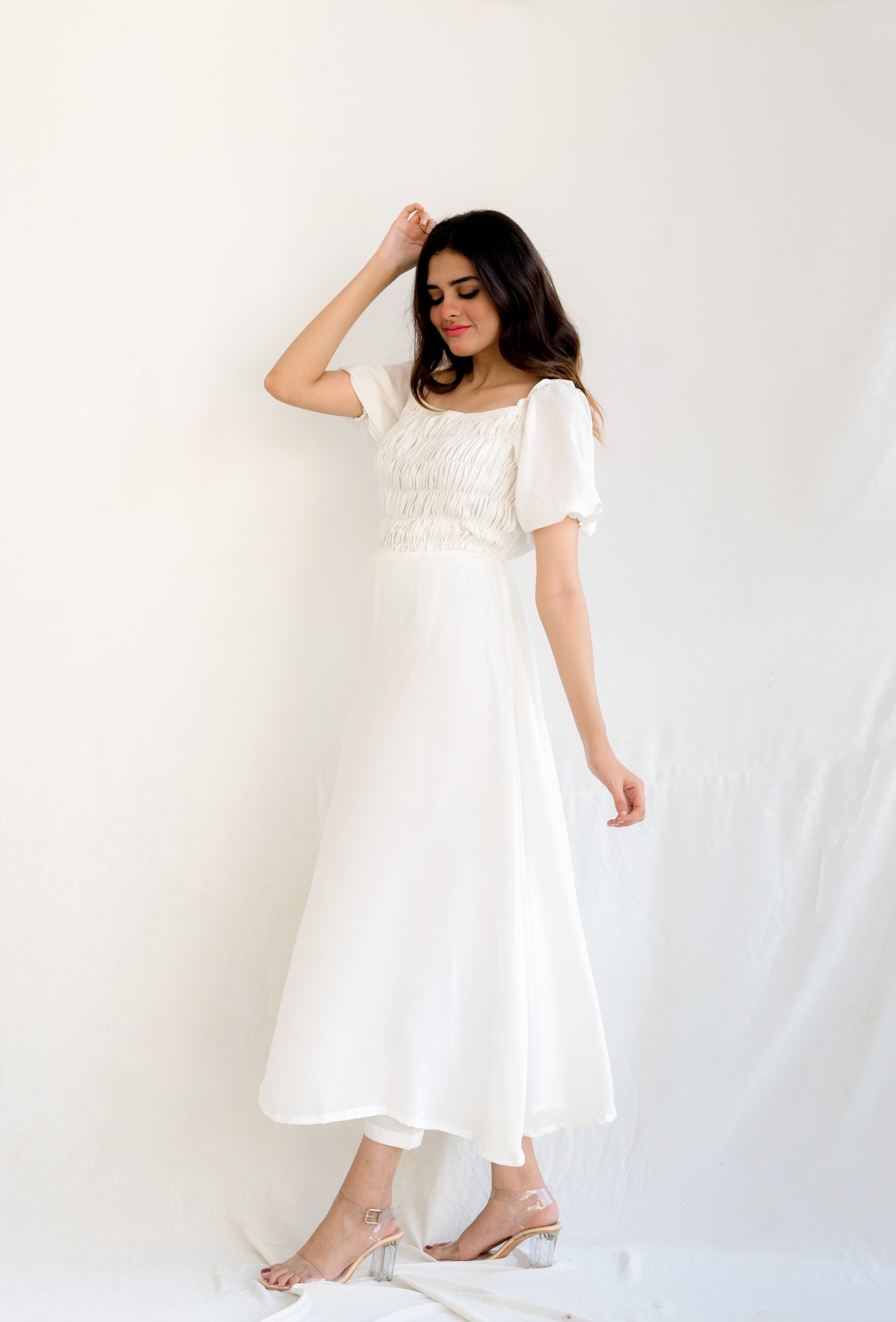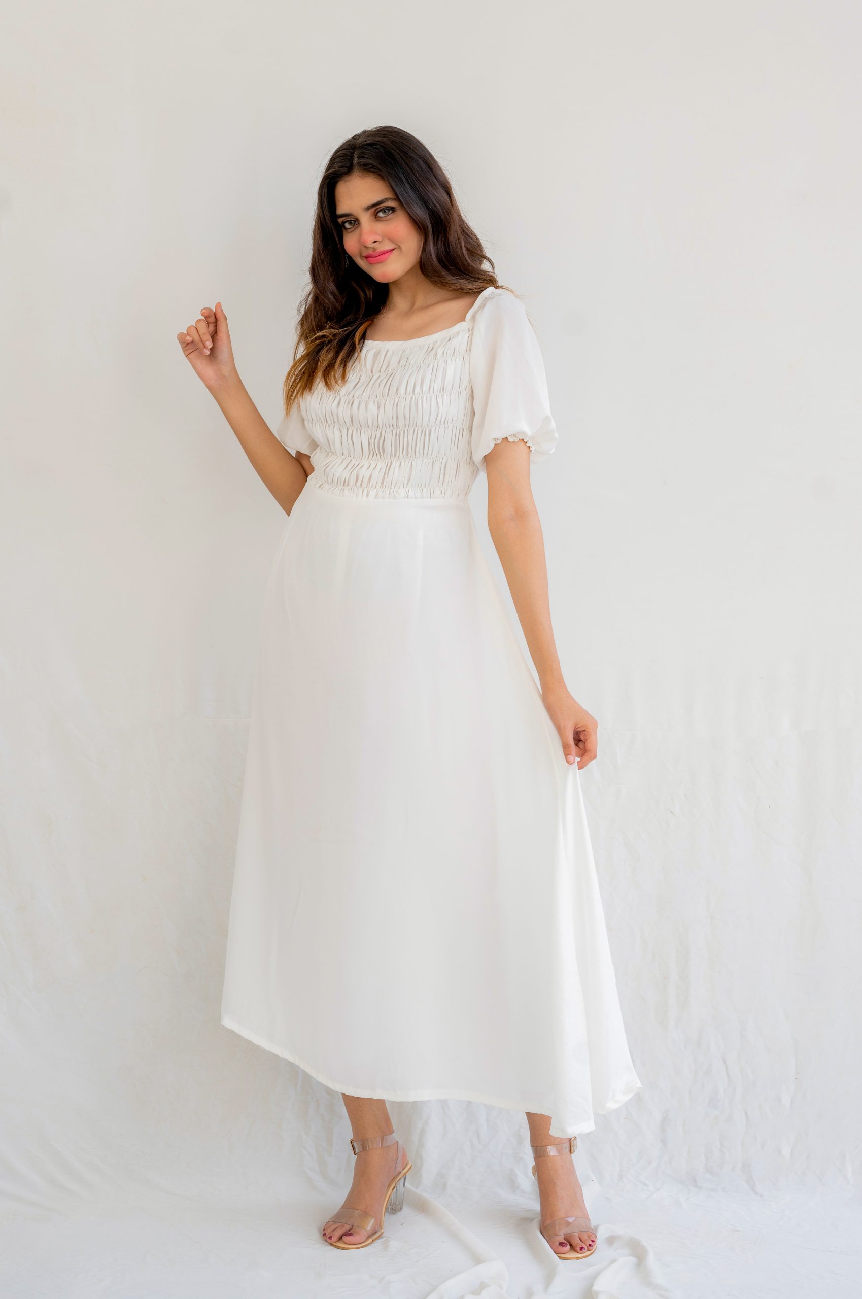 This elegant white maxi dress is a vision of ethereal elegance and pristine white beauty which perfect choice for any special occasion. The dress features half-puffed sleeves while the upper half of the dress is adorned with delicate pleats, creating a stunning texture and adding an element of sophistication.